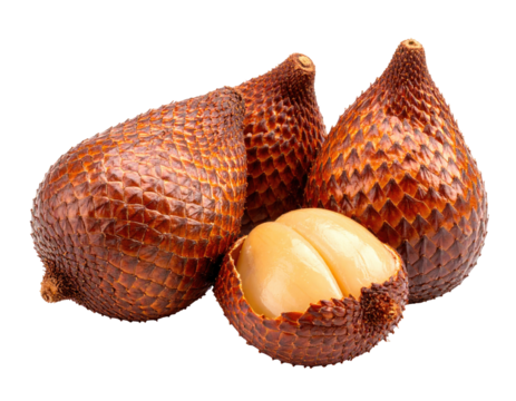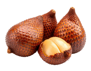 Three salak fruits, one halved, displaying brown scaly exterior and light beige interior