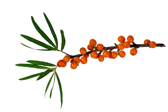 Sea buckthorn branch with vibrant orange berries and green leaves isolated on transparent background. Perfect for healthy food design, organic farming, herbal, and natural product concepts.