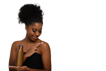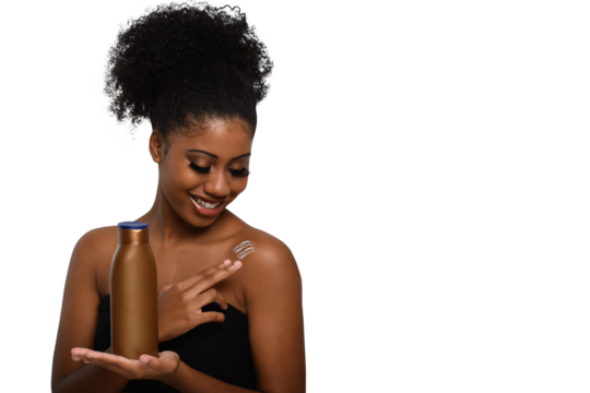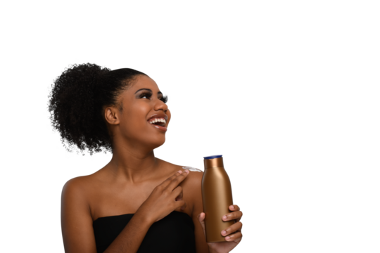 a woman applying moisturizing cream to her skin, smiling while holding a bottle demonstrating skin care