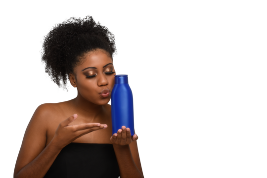 a woman kisses an unlabeled bottle of moisturizing cream demonstrating skin care