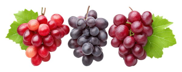 Red and black grape bunch isolated on transparent background with fresh green leaf