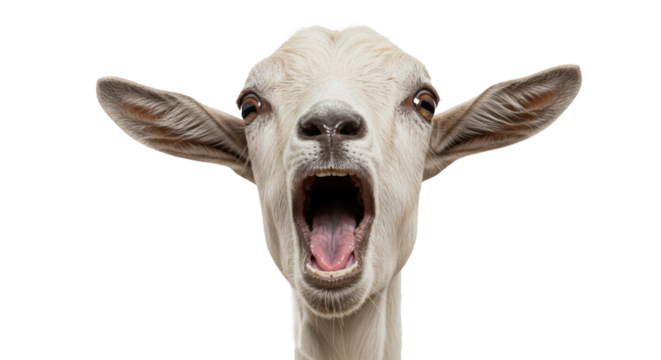 Goat bleating with wide-open mouth, loud vocal expression against transparent background