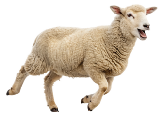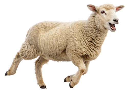Isolated image of a sheep with its mouth open, appearing to be jumping on a black background
