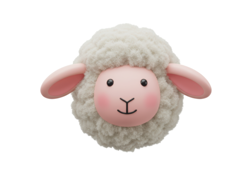 Isolated 3D Stylized Fluffy Sheep Head with Pink Ears and Cute Face