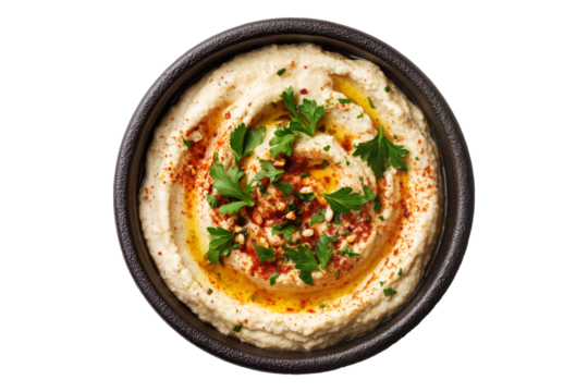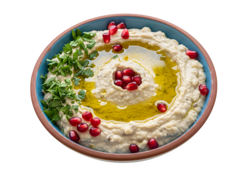 Baba ghanoush decorated with parsley and olive oil on transparent background