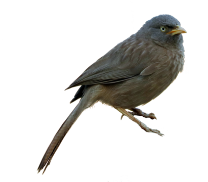Common Babbler, Brown bird with a slender body and long tail perched in a dynamic pose against a white background product shot isolated