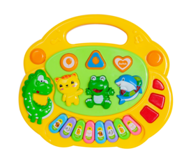 Bright plastic green and yellow multifunctional 8 keys kids toy piano / keyboard with animals for babies and toddlers on a transparent background png