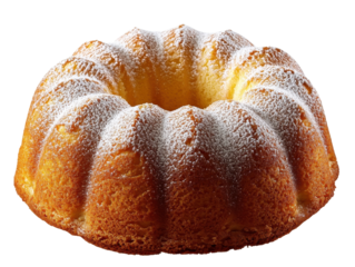 Bundt cake with powdered sugar dusting on transparent background