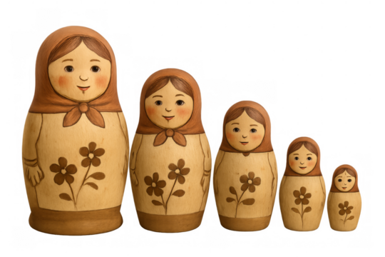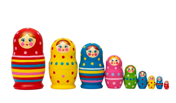 Five matryoshka dolls standing in decreasing size order on transparent background