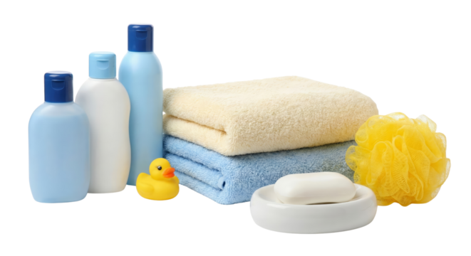 Baby Bath Time Essentials: Rubber Duck, Soap, Towels, and Lotions