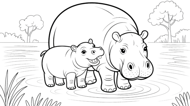 A heartwarming scene of a mother hippopotamus with her baby in a serene water landscape illustration