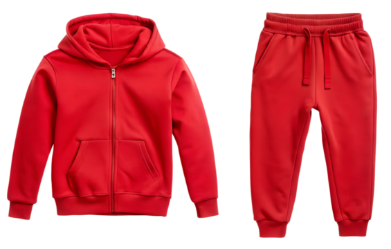 Kids sports suit red color with sweathoodie and sweatpants isolated on a white background. Children's casual sports style concept. Red tracksuit hoodie jacke and sweatpants joggers with pockets.PNG