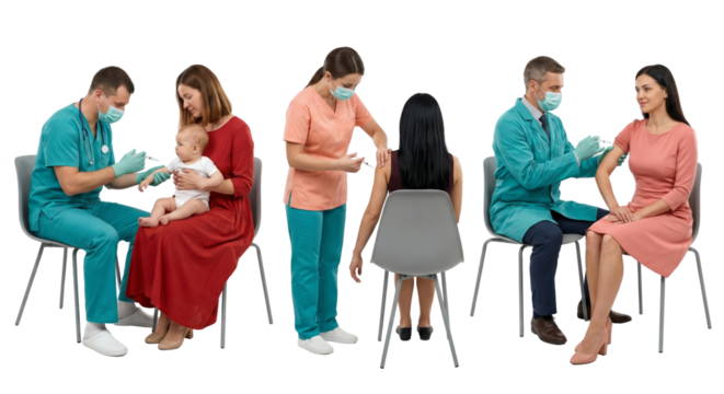 Medical professionals administering vaccines to adults and a baby, diverse group