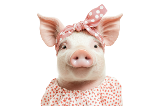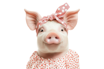 Pig wearing polka dot bandana and matching dress isolated on white or transparent PNG