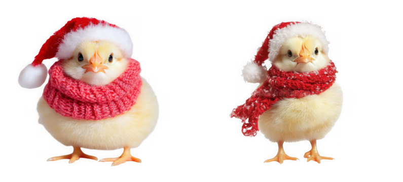 Two cute baby chicks wearing santa hats and red scarves, isolated on transparent background