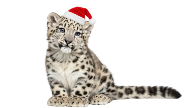 Cute Snow Leopard Cub Wearing Red Santa Hat for Christmas isolated PNG with Transparent Background