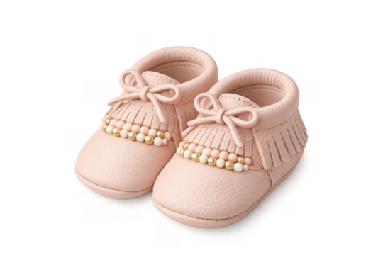 Closeup of a pair of beige and white leather baby shoes isolated on transparent background, perfect for new parents