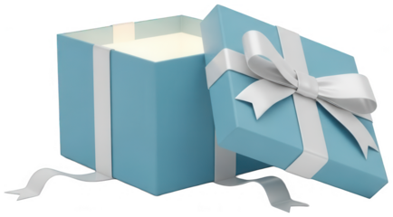 Light blue gift box with a white ribbon and bow, lid open revealing a soft glow inside
