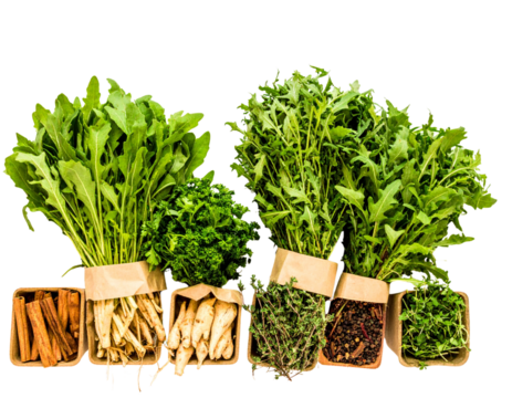 Collection of fresh herb leaves. arugula Spices, herbs on a white table. PNG Food bac