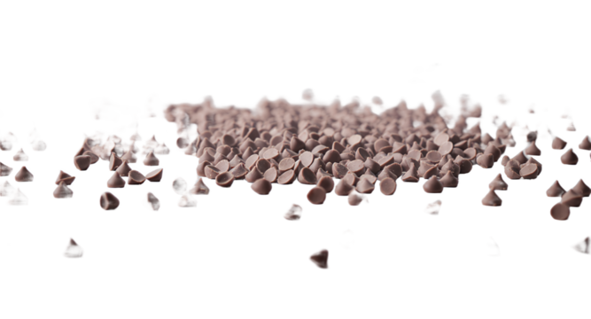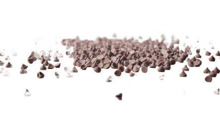 Chocolate chips scattered on white background, close-up photography of sweet dessert ingredient, food photography for recipe, baking, confectionery, cooking, culinary, chocolate morsels, food bac