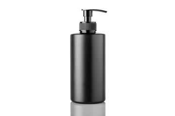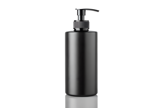 Black matte pump dispenser bottle mockup for soap, lotion, shampoo, or cosmetic products. Realistic packaging template for branding, label design, or skincare presentation. Isolated on transparent bac