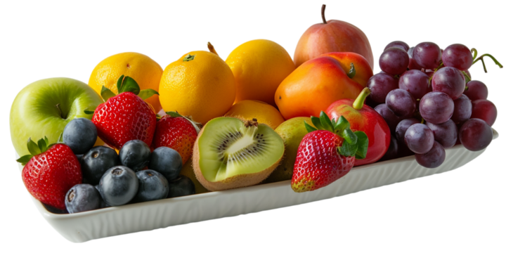 Juicy fruits and berries on white plate on transparent bacground, PNG.