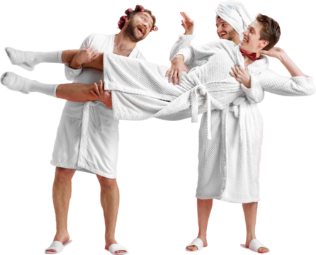 Three men in bathrobes carrying friend laughing together on transparent background. Concept of bachelor party promotion, male friendship, fun lifestyle visuals for event ads and social media.