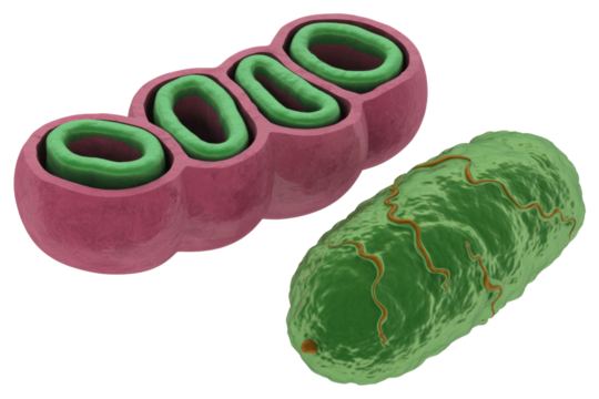 3D rendering showcasing a chloroplast structure with internal thylakoids alongside a rod-shaped bacterium, highlighting cellular biology and microorganisms. background removed
