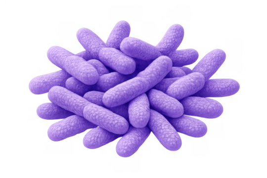 Purple rod-shaped bacteria colony on transparent background representing microbiology, infection, and science research