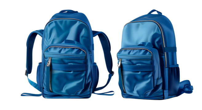 Two blue backpacks with zippers and pockets