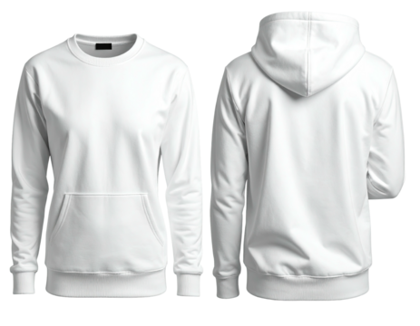 Blank white sweatshirt and hoodie, front and back views