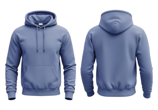 Front and back view of a periwinkle blue hoodie with a front pocket and hood isolated on transparent background