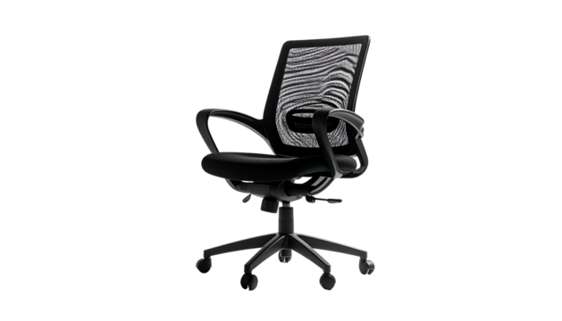 Ergonomic black office chair with mesh back, arms, and adjustable height on wheels