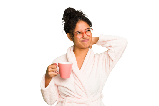 Young brazilian woman wearing a pajama holding a cup isolated touching back of head, thinking and making a choice.