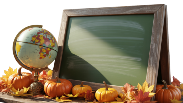 Autumnal school chalkboard with globe and pumpkins for education concept