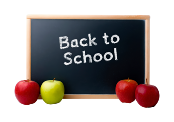 Back to school chalkboard with apples on display on transparent background, PNG