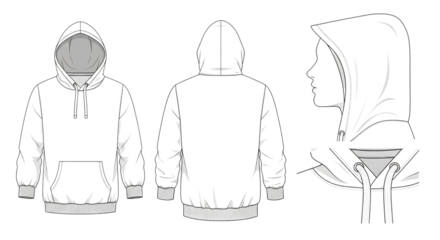 Three views of a blank white hoodie outline front back and side design