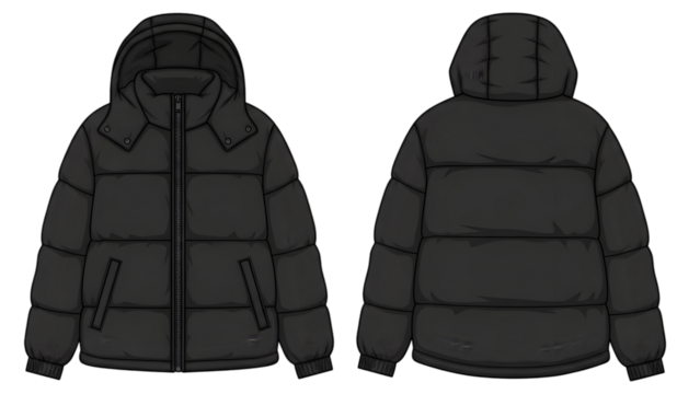 Black puffer jacket with hood front and back view technical flat sketch for fashion design isolated on transparent background