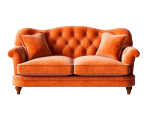 A luxurious and comfortable orange velvet chesterfield sofa with tufted back and plush cushions, isolated on a transparent background, perfect for interior design and furniture concepts