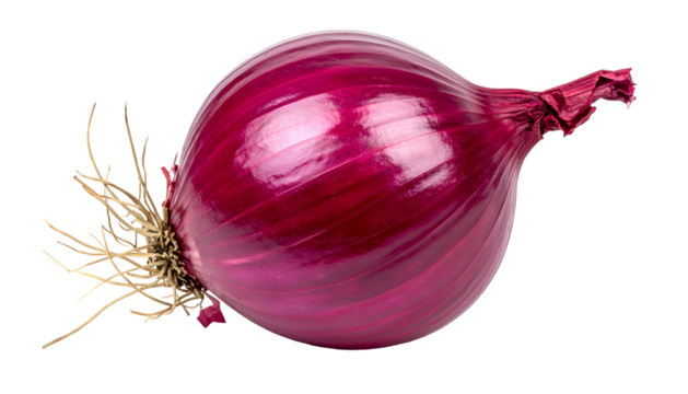 A single, vibrant red onion, whole with root and top detail, isolated against a black backdrop