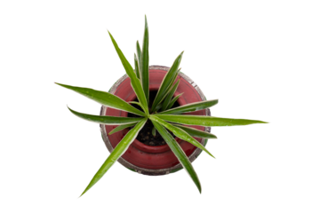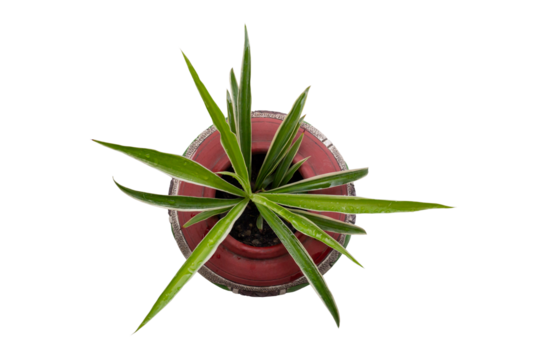 Top view of young Spider Plant or Chlorophytum bichetii (Karrer) Backer plant is growing in brown pot isolated on white background included clipping path.
