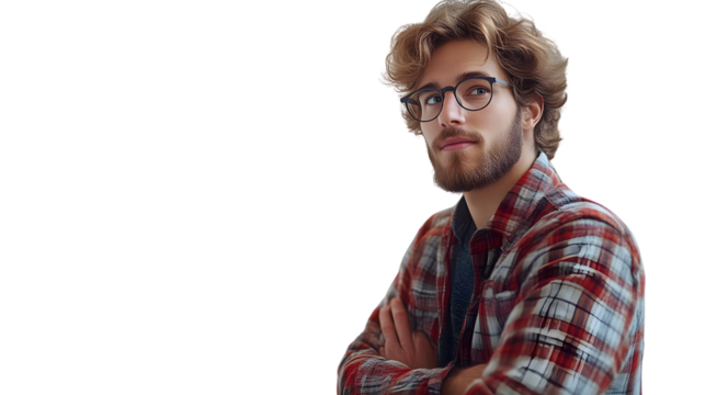 A man with glasses and a beard wearing a plaid shirt looking thoughtful against a black backgr