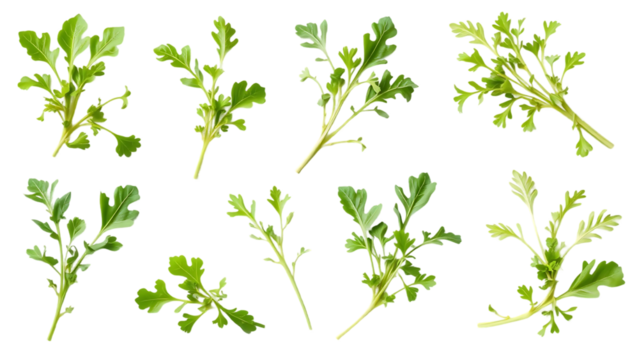 Set collection of fresh green arugula leaves in various positions isolated over a transparent backgr