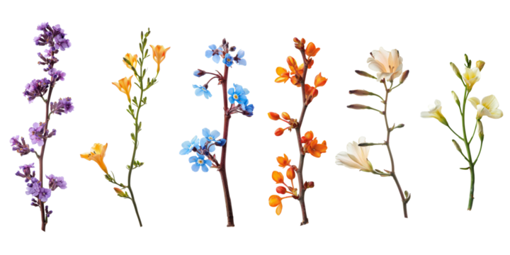 Set of beautiful Twig with small colorful flowers and leaves isolated on background, spring meadow for decoration.