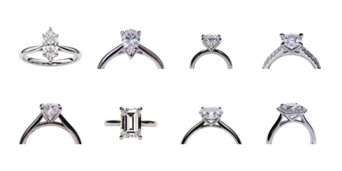 Six different views of a solitaire diamond ring in gold and silver settings, isolated on transparent background