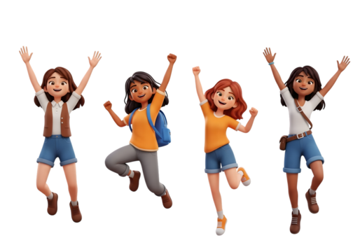 Four diverse cartoon girls in casual summer clothes jumping with joy isolated on a transparent background