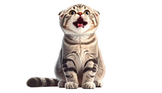 Adorable, cartoon-like Scottish Fold kitten with open mouth, light fur, and folded ears