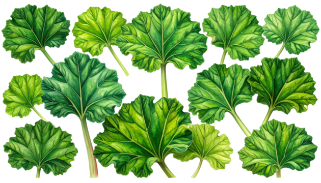 Vibrant green rhubarb leaves arranged on black, detailed, artistic botanical