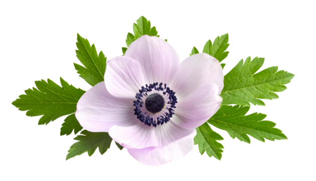 A delicate pale pink anemone with a dark center, surrounded by green, deeply cut leaves