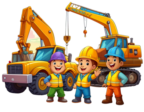 Cartoon Style Construction Site with Cranes and Bulldozers, Colorful Illustration PNG